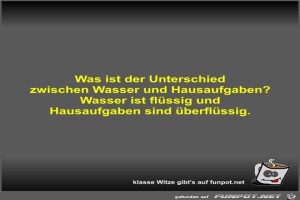 | Was ist der Unterschied zwischen Wasser und Hausaufgaben? Bild (24.76 KB) 5Lustiges → klasse Sprüche und Witze | Lustiges → klasse Sprüche und Witze | 16.11.22-12:54 | Fossy | |