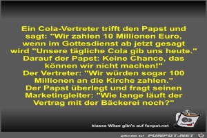 | Ein Cola-Vertreter trifft den Papst und sagt Bild (56.11 KB) 7Lustiges → klasse Sprüche und Witze | Lustiges → klasse Sprüche und Witze | 29.10.22-11:36 | Fossy | |