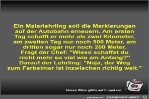| Ein Malerlehrling soll die Markierungen auf der Autobahn... Bild (49.62 KB) 6Lustiges → klasse Sprüche und Witze | Lustiges → klasse Sprüche und Witze | 29.10.22-14:25 | Fossy | |