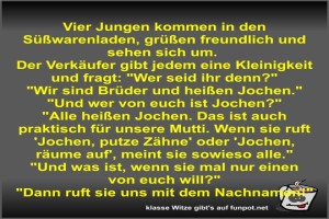 | Vier Jungen kommen in den Süßwarenladen Bild (67.71 KB) 1Lustiges → klasse Sprüche und Witze | Lustiges → klasse Sprüche und Witze | 22.06.-11:20 | Fossy | |