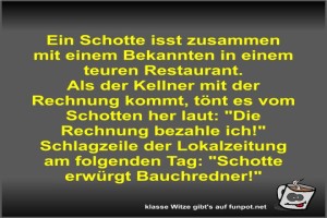 | Ein Schotte isst zusammen mit einem Bekannten in einem... Bild (51.44 KB) 3Lustiges → klasse Sprüche und Witze | Lustiges → klasse Sprüche und Witze | 23.06.-12:25 | Fossy | |