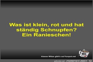 | Was ist klein, rot und hat ständig Schnupfen? Bild (23.44 KB) 6Lustiges → klasse Sprüche und Witze | Lustiges → klasse Sprüche und Witze | 18.10.22-09:42 | Fossy | |