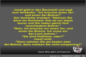 | Josef geht in den Baumarkt und sagt zum Verkäufer Bild (52.91 KB) 9Lustiges → klasse Sprüche und Witze | Lustiges → klasse Sprüche und Witze | 17.10.22-16:56 | Fossy | |