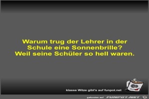 | Warum trug der Lehrer in der Schule eine Sonnenbrille? Bild (22.87 KB) 4Lustiges → klasse Sprüche und Witze | Lustiges → klasse Sprüche und Witze | 17.10.22-09:25 | Fossy | |