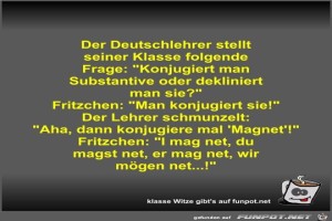 | Der Deutschlehrer stellt seiner Klasse folgende Frage Bild (43.18 KB) 9Lustiges → klasse Sprüche und Witze | Lustiges → klasse Sprüche und Witze | 07.10.22-16:24 | Fossy | |