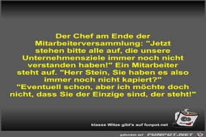 | Der Chef am Ende der Mitarbeiterversammlung Bild (46.8 KB) 7Lustiges → klasse Sprüche und Witze | Lustiges → klasse Sprüche und Witze | 06.10.22-10:16 | Fossy | |