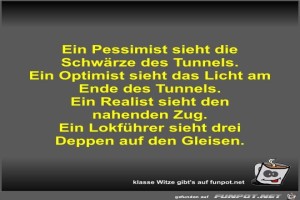 | Ein Pessimist sieht die Schwärze des Tunnels Bild (38.58 KB) 7Lustiges → klasse Sprüche und Witze | Lustiges → klasse Sprüche und Witze | 14.09.22-10:30 | Fossy | |