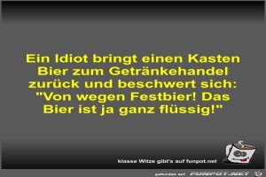 | Ein Idiot bringt einen Kasten Bier zum Getränkehandel... Bild (34.53 KB) 2Lustiges → klasse Sprüche und Witze | Lustiges → klasse Sprüche und Witze | 02.09.22-10:39 | Fossy | |