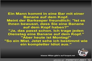 | Ein Mann kommt in eine Bar mit einer Banane auf dem Kopf Bild (50.51 KB) 7Lustiges → klasse Sprüche und Witze | Lustiges → klasse Sprüche und Witze | 04.09.22-10:34 | Fossy | |