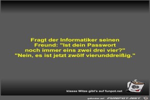 | Fragt der Informatiker seinen Freund Bild (24.3 KB) 5Lustiges → klasse Sprüche und Witze | Lustiges → klasse Sprüche und Witze | 02.09.22-17:42 | Fossy | |