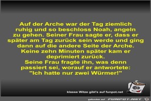 | Auf der Arche war der Tag ziemlich ruhig und so beschloss... Bild (50.9 KB) 4Lustiges → klasse Sprüche und Witze | Lustiges → klasse Sprüche und Witze | 26.08.22-14:55 | Fossy | |