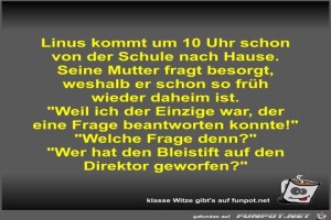 | Linus kommt um 10 Uhr schon von der Schule nach Hause Bild (49.21 KB) 7Lustiges → klasse Sprüche und Witze | Lustiges → klasse Sprüche und Witze | 28.08.22-19:03 | Fossy | |