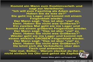 | Kommt ein Mann zum Kostümverleih und sagt zur Verleiherin Bild (81.22 KB) 3Lustiges → klasse Sprüche und Witze | Lustiges → klasse Sprüche und Witze | 28.08.22-14:25 | Fossy | |