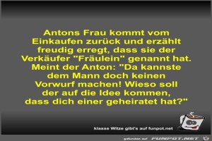 | Antons Frau kommt vom Einkaufen zurück und erzählt freudig Bild (45.81 KB) 5Lustiges → klasse Sprüche und Witze | Lustiges → klasse Sprüche und Witze | 26.08.22-11:37 | Fossy | |