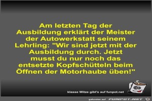 | Am letzten Tag der Ausbildung erklärt der Meister der... Bild (43.35 KB) 8Lustiges → klasse Sprüche und Witze | Lustiges → klasse Sprüche und Witze | 18.08.22-13:44 | Fossy | |