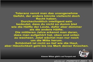 | Toleranz nennt man das unangenehme Gefühl Bild (50.56 KB) 2Lustiges → klasse Sprüche und Witze | Lustiges → klasse Sprüche und Witze | 05.08.22-13:50 | Fossy | |