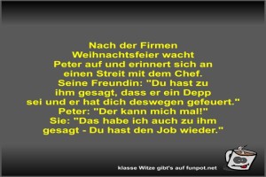 | Nach der Firmen Weihnachtsfeier wacht Peter auf und... Bild (41.25 KB) 2Lustiges → klasse Sprüche und Witze | Lustiges → klasse Sprüche und Witze | 14.06.-13:25 | Fossy | |