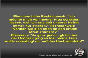 | Ehemann beim Rechtsanwalt Bild (45.44 KB) von Fossy am 12. Juni 2025 um 12:55 Uhr Lustiges → klasse Sprüche und Witze | Lustiges → klasse Sprüche und Witze | 12.06.-12:55 | Fossy | ||