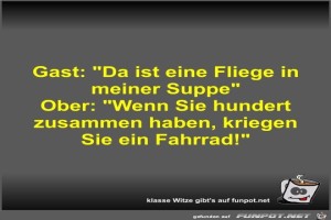 | Gast: "Da ist eine Fliege in meiner Suppe" Bild (32.04 KB) 5Lustiges → klasse Sprüche und Witze | Lustiges → klasse Sprüche und Witze | 25.07.22-13:36 | Fossy | |