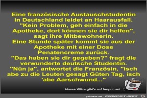 | Eine französische Austauschstudentin in Deutschland leidet Bild (62.99 KB) 10Lustiges → klasse Sprüche und Witze | Lustiges → klasse Sprüche und Witze | 16.07.22-10:15 | Fossy | |