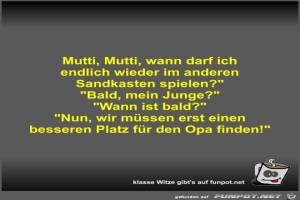 | Mutti, Mutti, wann darf ich endlich wieder im anderen... Bild (32.16 KB) 4Lustiges → klasse Sprüche und Witze | Lustiges → klasse Sprüche und Witze | 11.07.22-17:36 | Fossy | |