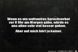 | Sprechverbot vor 8 Uhr Bild (91.99 KB) 3Lustiges → klasse Sprüche und Witze | Lustiges → klasse Sprüche und Witze | 01.07.22-07:03 | ||
