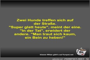 | Zwei Hunde treffen sich auf der Straße Bild (29.37 KB) 6Lustiges → klasse Sprüche und Witze | Lustiges → klasse Sprüche und Witze | 02.07.22-19:27 | Fossy | |