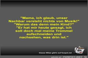 | "Mama, ich glaub, unser Nachbar versteht nichts von Musik!" Bild (33.99 KB) 6Lustiges → klasse Sprüche und Witze | Lustiges → klasse Sprüche und Witze | 01.07.22-14:39 | Fossy | |