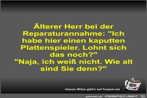 | Älterer Herr bei der Reparaturannahme Bild (37.19 KB) 4Lustiges → klasse Sprüche und Witze | Lustiges → klasse Sprüche und Witze | 08.06.22-19:16 | Fossy | |
