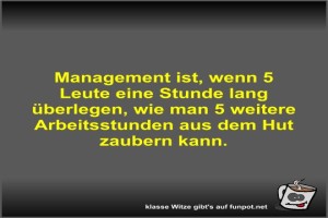 | Management ist, wenn 5 Leute eine Stunde lang überlegen,... Bild (30.78 KB) 1Lustiges → klasse Sprüche und Witze | Lustiges → klasse Sprüche und Witze | 08.06.-12:41 | Fossy | |