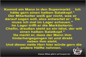 | Kommt ein Mann in den Supermarkt Bild (61.49 KB) 4Lustiges → klasse Sprüche und Witze | Lustiges → klasse Sprüche und Witze | 07.06.-10:20 | Fossy | |