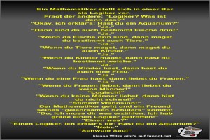 | Ein Mathematiker stellt sich in einer Bar als Logiker vor Bild (85.35 KB) 2Lustiges → klasse Sprüche und Witze | Lustiges → klasse Sprüche und Witze | 08.06.-10:11 | Fossy | |