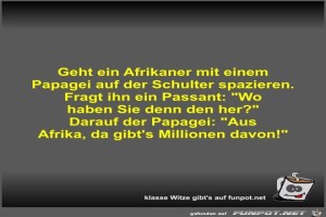 | Geht ein Afrikaner mit einem Papagei auf der Schulter... Bild (33.13 KB) 8Lustiges → klasse Sprüche und Witze | Lustiges → klasse Sprüche und Witze | 03.06.22-17:14 | Fossy | |