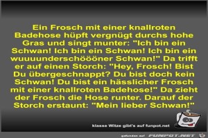 | Ein Frosch mit einer knallroten Badehose hüpft vergnügt... Bild (63.6 KB) 8Lustiges → klasse Sprüche und Witze | Lustiges → klasse Sprüche und Witze | 03.06.22-10:43 | Fossy | |