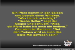 | Ein Pferd kommt in den Saloon und bestellt einen Whiskey Bild (41.67 KB) 6Lustiges → klasse Sprüche und Witze | Lustiges → klasse Sprüche und Witze | 03.06.22-13:22 | Fossy | |