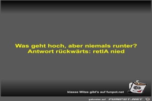 | Was geht hoch, aber niemals runter? Bild (18.07 KB) 5Lustiges → klasse Sprüche und Witze | Lustiges → klasse Sprüche und Witze | 24.05.22-17:26 | Fossy | |