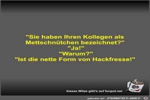 | Sie haben Ihren Kollegen als Mettschnütchen bezeichnet? Bild (23.98 KB) 5Lustiges → klasse Sprüche und Witze | Lustiges → klasse Sprüche und Witze | 23.05.22-10:52 | Fossy | |