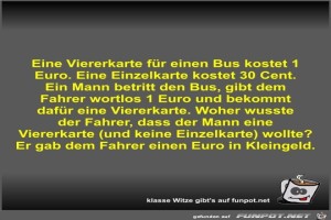 | Eine Viererkarte für einen Bus kostet 1 Euro Bild (45.77 KB) 4Lustiges → klasse Sprüche und Witze | Lustiges → klasse Sprüche und Witze | 14.05.22-18:39 | Fossy | |