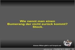 | Wie nennt man einen Bumerang der nicht zurück kommt? Bild (18 KB) 6Lustiges → klasse Sprüche und Witze | Lustiges → klasse Sprüche und Witze | 13.05.22-10:11 | Fossy | |