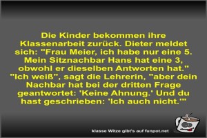 | Die Kinder bekommen ihre Klassenarbeit zurück Bild (50.63 KB) 2Lustiges → klasse Sprüche und Witze | Lustiges → klasse Sprüche und Witze | 05.06.-13:19 | Fossy | |