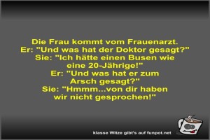 | Die Frau kommt vom Frauenarzt Bild (35.14 KB) 3Lustiges → klasse Sprüche und Witze | Lustiges → klasse Sprüche und Witze | 05.06.-10:10 | Fossy | |