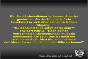 | Ein Sanitär-Installateur im besten Alter ist gestorben Bild (44.71 KB) 2Lustiges → klasse Sprüche und Witze | Lustiges → klasse Sprüche und Witze | 04.06.-10:54 | Fossy | |