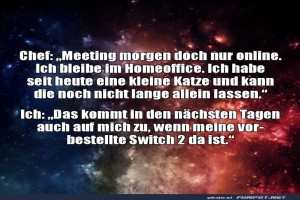 | Homeoffice mit Katze und Switch Bild (151.23 KB) 1Lustiges → klasse Sprüche und Witze | Lustiges → klasse Sprüche und Witze | 04.06.-09:08 | ||