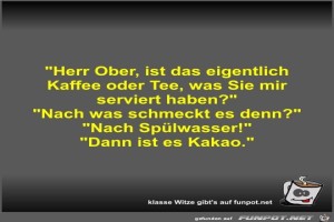 | Herr Ober, ist das eigentlich Kaffee oder Tee, was Sie mir Bild (32.73 KB) 7Lustiges → klasse Sprüche und Witze | Lustiges → klasse Sprüche und Witze | 08.05.22-10:49 | Fossy | |