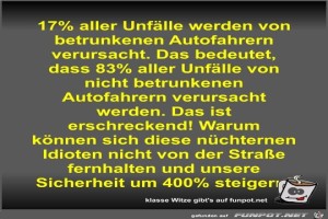 | 17% aller Unfälle werden von betrunkenen Autofahrern... Bild (57.66 KB) 11Lustiges → klasse Sprüche und Witze | Lustiges → klasse Sprüche und Witze | 04.05.22-12:50 | Fossy | |