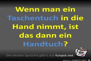 | Ein Handtuch Bild (66.77 KB) 5Lustiges → klasse Sprüche und Witze Wenn man mal richtig darüber nachdenkt, könnte man das Taschentuch dann durchaus als Handtuch bezeichnen ;-) | Lustiges → klasse Sprüche und Witze | 02.05.22-11:47 | ||