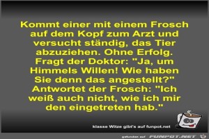 | Kommt einer mit einem Frosch auf dem Kopf zum Arzt und... Bild (51.83 KB) 3Lustiges → klasse Sprüche und Witze | Lustiges → klasse Sprüche und Witze | 03.05.22-20:24 | Fossy | |