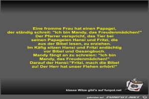 | Eine fromme Frau hat einen Papagei Bild (40.55 KB) 6Lustiges → klasse Sprüche und Witze | Lustiges → klasse Sprüche und Witze | 02.05.22-19:58 | Fossy | |