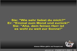 | Sie: Wie sehr liebst du mich? Bild (25.66 KB) 6Lustiges → klasse Sprüche und Witze | Lustiges → klasse Sprüche und Witze | 04.05.22-10:29 | Fossy | |