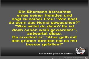 | Ein Ehemann betrachtet eines seiner Hemden und sagt zu... Bild (48.79 KB) 5Lustiges → klasse Sprüche und Witze | Lustiges → klasse Sprüche und Witze | 01.05.22-16:44 | Fossy | |